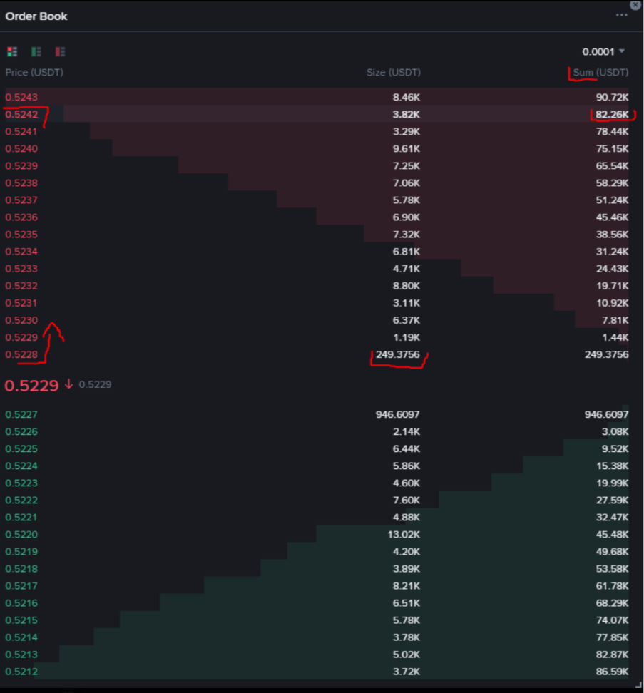 - To fill $85k, your order would “eat through” multiple levels of the order book, ending up at 0.5243.