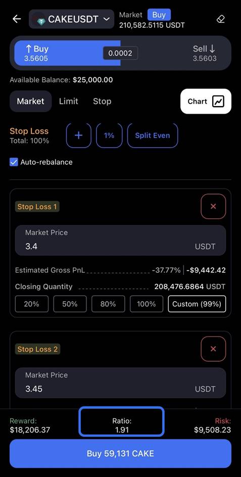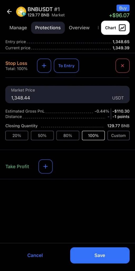Moving your Stop Loss to Entry is now a single click. So is opening a position with 1% of Balance, closing all open positions or setting a Stop Loss at 1% of your Balance. As you move through the app you will find these buttons that will increase your speed and precision.